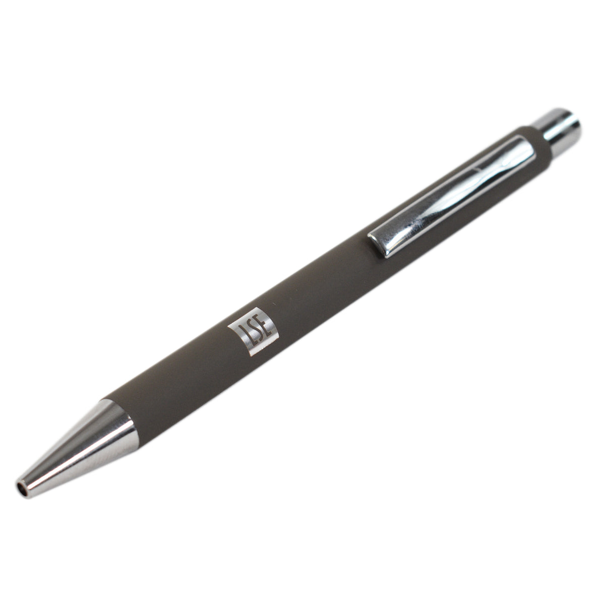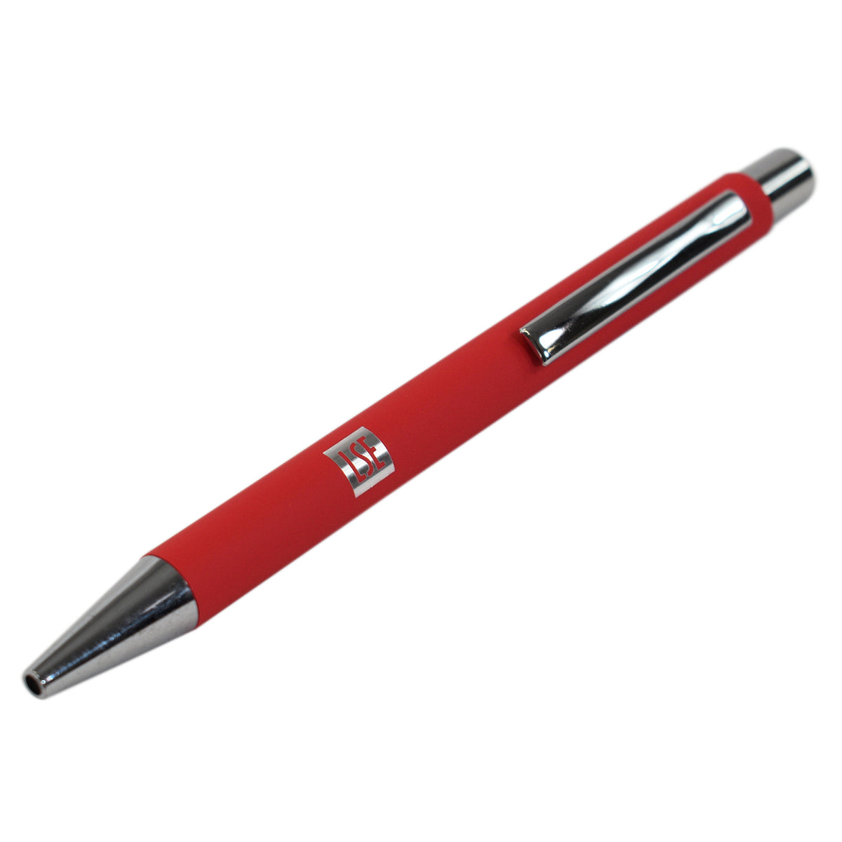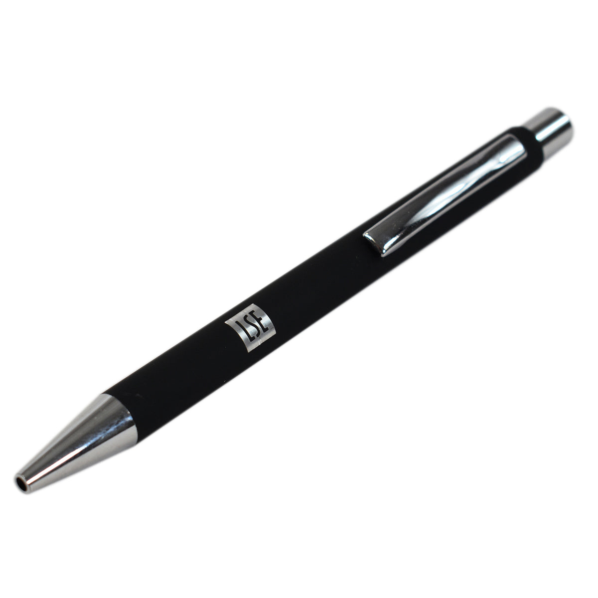 This executive push-action metal ballpoint pen, featuring the LSE logo, boasts a sleek chrome trim and is available in a range of colours.